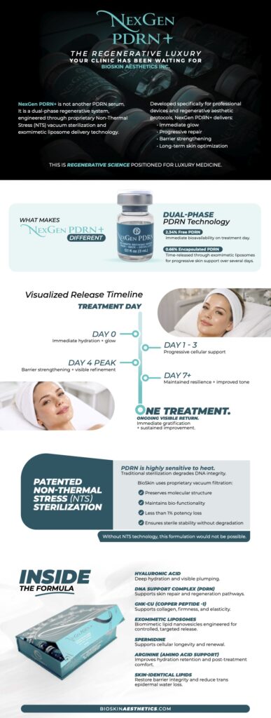 Built using advanced non-thermal sterile filtration to protect molecular integrity (because degraded actives don’t create premium results), NexGen PDRN+ preserves what matters — potency, stability, and consistency.